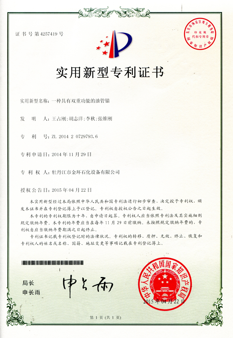 一種具有雙重功能的油管錨實(shí)用新型專利證書(shū)ZL 2014 2 0729793.6