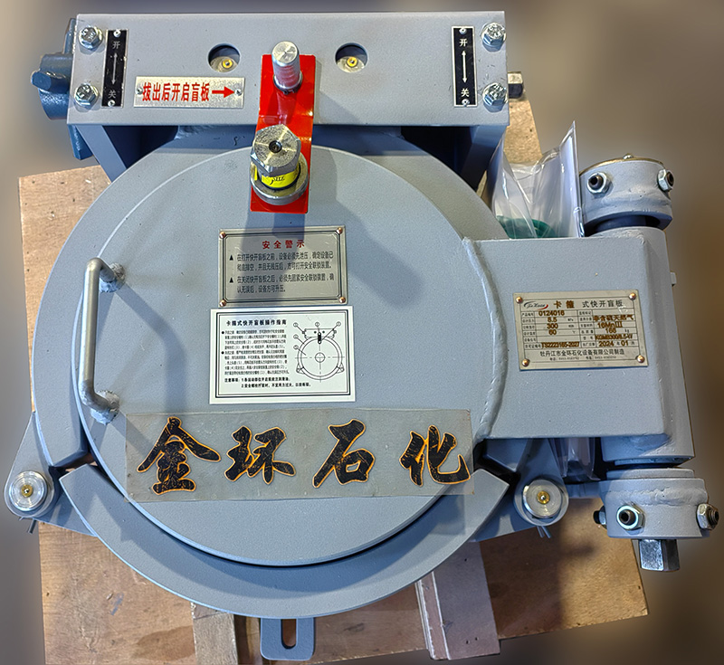 快開盲板是用于壓力管道或壓力容器的圓形開口上的一種機(jī)械裝置。一般由筒體法蘭、頭蓋、勾圈或卡箍、密封圈、安全聯(lián)鎖機(jī)構(gòu)、開閉機(jī)構(gòu)、轉(zhuǎn)臂及短節(jié)(需要時(shí))等部件構(gòu)成。